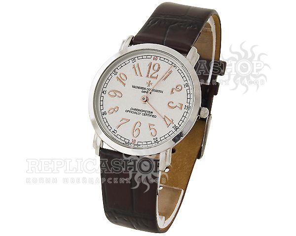 Механизм: кварцевый японский. Функции: часы, минуты. Корпус: стальной с покрытием IPG, сапфировое стекло. Циферблат: белый; позолоченные арабские цифры. Ремешок/браслет: коричневый кожаный ремешок с классической застежкой Vacheron Constantin.
